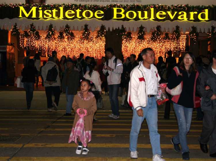 In de tunnel hangen honderden snoeren met lichtjes eraan op de palen is mistletoe bevestigd. |