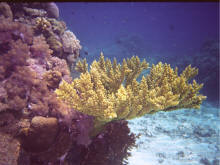 Apo Island - Geel juffertje boven koraalschaal |