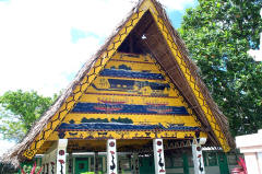 Voorgevel van traditionele 'Bai' beschilderd met historische taferelen uit mythen en legendes |