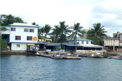 Vanaf onze ankerplaats hebben we zicht op de steigers van de duikschool en de Palau jachtclub |