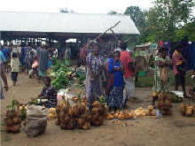 Vrouwen uit het nabijgelegen dorp brengen er fruit en groenten uit hun tuinen |