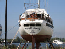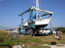 In de travelift van de scheepswerf wordt 'Alexandra' op de kant getild en naar haar plek gereden |