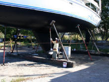 Het onderwaterschip wordt kaal gemaakt en er worden twee lagen anti-fouling verf opgebracht |