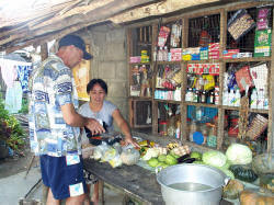 In een sarisari winkeltje kopen we aubergientjes, tomaten en een kooltje |